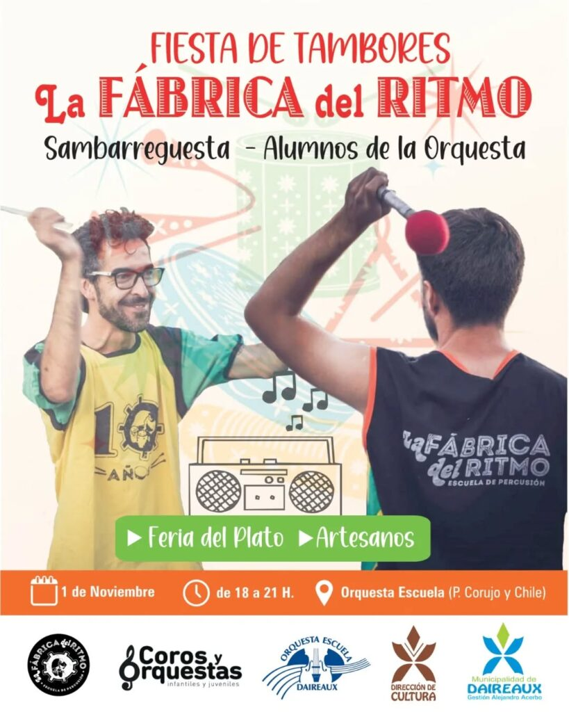 El próximo sábado 1 de noviembre se llevará a cabo la Fiesta de Tambores en el Centro Cultural Orquesta Escuela de Daireaux, con la participación de La Fábrica del Ritmo, escuela de percusión coordinada por el profesor Raúl Chillón.